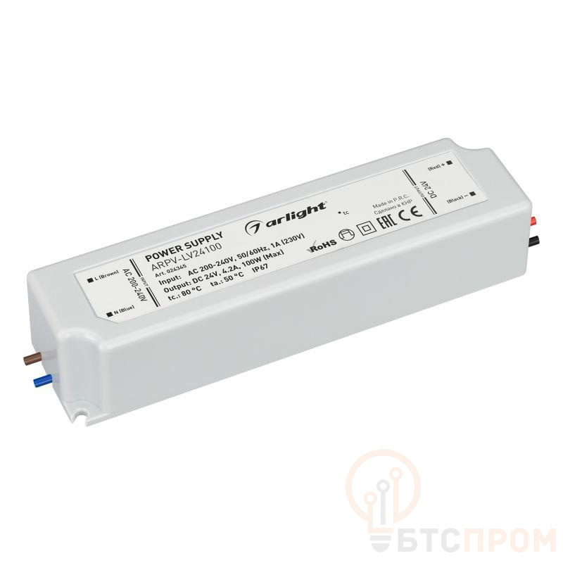 Источник напряжения с гальванической развязкой для светодиодных изделий. Входное напряжение 200-240 VAC. Выходные параметры: 24 В, 4,2 А, 100 Вт. Встроенный PFC >0,5. Герметичный пластиковый корпус IP 67. Рабочая температура -20…+50C?. Габаритные размеры длина 162 мм, ширина 42 мм, высота 34 мм. Гарантийный срок 2 года.