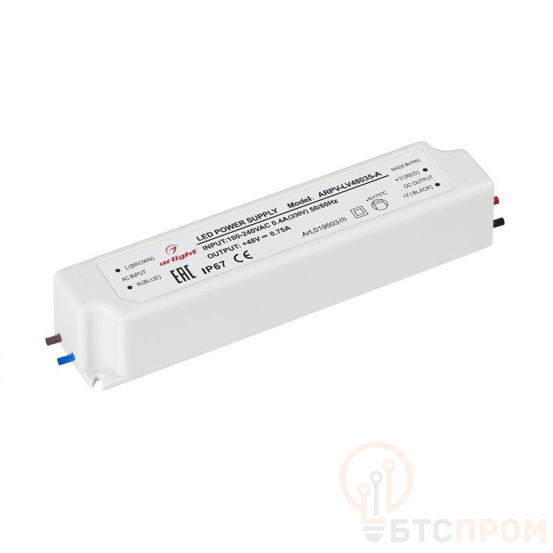Источник напряжения с гальванической развязкой для светодиодных изделий. Входное напряжение 100-240 VAC. Выходные параметры: 48 В, 0,75 А, 36 Вт. Встроенный PFC >0,5. Герметичный пластиковый корпус IP 67. Рабочая температура -20…+50C?. Габаритные размеры длина 148 мм, ширина 32 мм, высота 29 мм. Гарантийный срок 3 года.