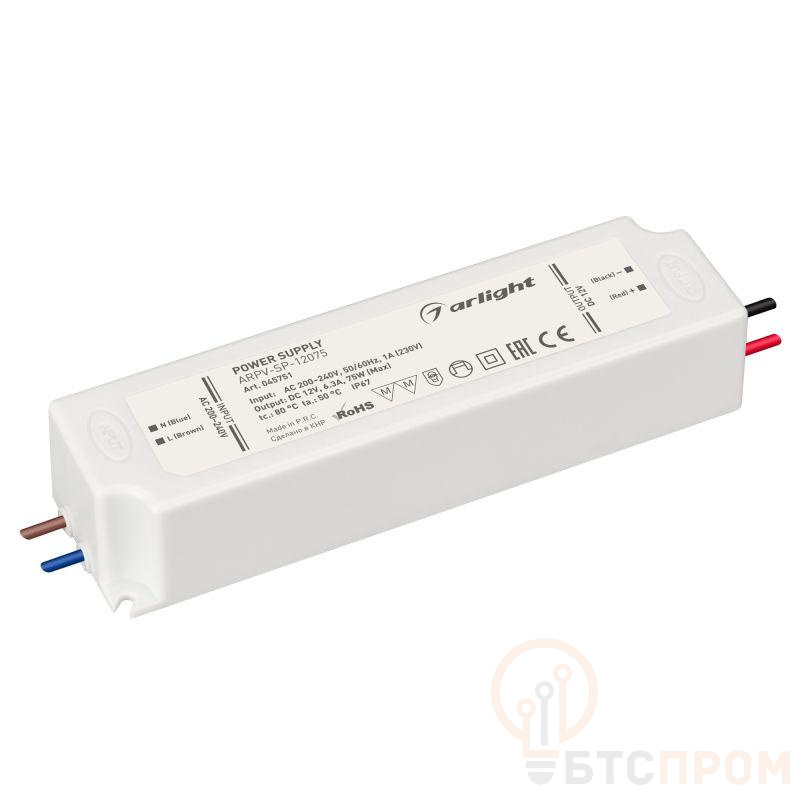 Источник напряжения с гальванической развязкой для светодиодных изделий. Входное напряжение 200-240 VAC. Выходные параметры: 12 В, 6,3 А, 75Вт. Встроенный PFC >0.5. Герметичный пластиковый корпус IP 67. Рабочая температура -30…+70C?. Габаритные размеры длина 150 мм, ширина 40 мм, высота 30 мм. Гарантийный срок 5 лет.