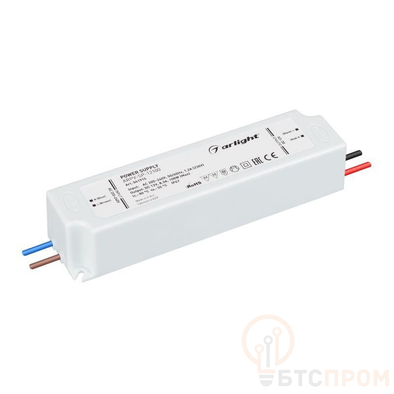 Источник напряжения с гальванической развязкой для светодиодных изделий. Входное напряжение 200-240 VAC. Выходные параметры: 12 В, 8,3 А, 100Вт. Встроенный PFC >0.5. Герметичный пластиковый корпус IP 67. Рабочая температура -30…+70C?. Габаритные размеры длина 162.5 мм, ширина 42.5 мм, высота 32 мм. Гарантийный срок 5 лет. Режим CV+CC - при превышении выходной мощности снижается напряжение, переходит в режим источника тока.