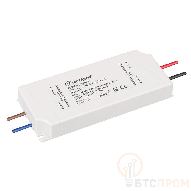 Источник напряжения с гальванической развязкой для светодиодных изделий. Входное напряжение 200-240 VAC. Выходные параметры: 24 В, 1.67 А, 40 Вт. Встроенный PFC >0.92. Сверхтонкий герметичный пластиковый корпус IP44. Габаритные размеры длина 129.5 мм, ширина 55 мм, высота 17 мм. Гарантийный срок 5 лет.