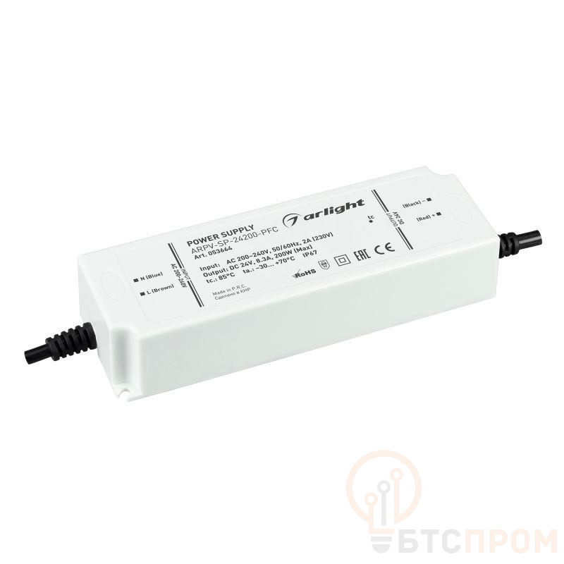 Источник напряжения с гальванической развязкой для светодиодных изделий. Входное напряжение 200-240 VAC. Выходные параметры: 24 В, 8,3 А, 200Вт. Встроенный PFC >0.95. Герметичный пластиковый корпус IP 67. Рабочая температура -30…+70C?. Габаритные размеры длина 190 мм, ширина 63 мм, высота 38 мм. Гарантийный срок 5 лет. Режим CV+CC - при превышении выходной мощности снижается напряжение, переходит в режим источника тока.