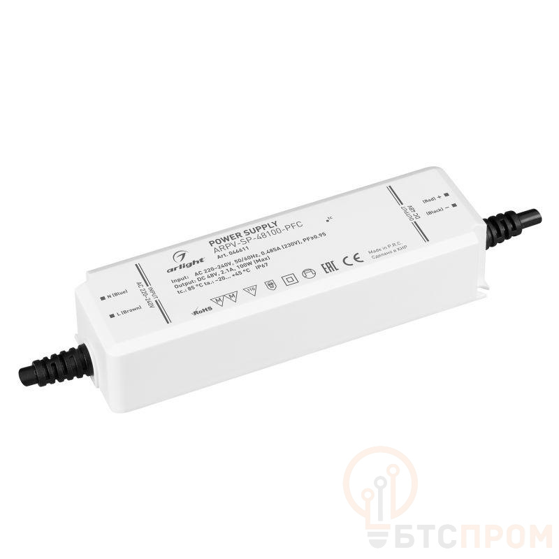 Источник напряжения с гальванической развязкой для светодиодных изделий. Входное напряжение 220-240 VAC. Выходные параметры: 48 В, 2,1 А, 100Вт. Встроенный PFC >0.95. Герметичный пластиковый корпус IP 67. Рабочая температура -20…+45C?. Габаритные размеры длина 156 мм, ширина 48 мм, высота 33 мм. Гарантийный срок 5 лет.