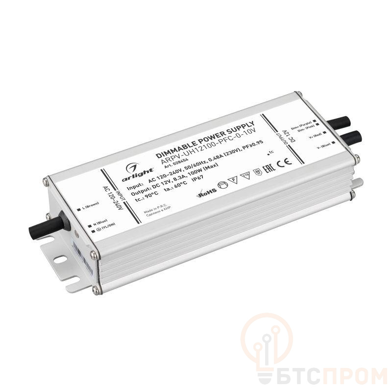Диммируемый источник напряжения по стандарту 0/1-10 В с гальванической развязкой для светодиодных изделий. Входное напряжение 120-240 VAC. Выходные параметры: 12 В, 8.3 А, 100 Вт. Встроенный PFC >0,9. Герметичный алюминиевый корпус IP 67. Габаритные размеры длина 188 мм, ширина 67.5 мм, высота 33.5 мм. Гарантийный срок 7 лет.