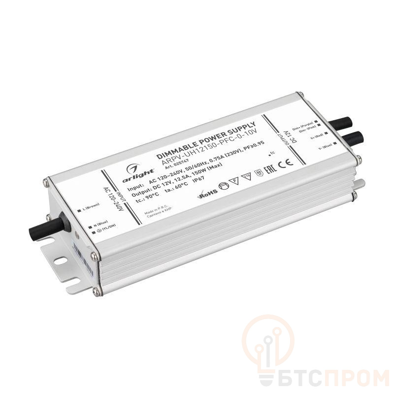 Диммируемый источник напряжения по стандарту 0/1-10 В с гальванической развязкой для светодиодных изделий. Входное напряжение 120-240 VAC. Выходные параметры: 12 В, 12.5 А, 150 Вт. Встроенный PFC >0,9. Герметичный алюминиевый корпус IP 67. Габаритные размеры длина 188 мм, ширина 67.5 мм, высота 33.5 мм. Гарантийный срок 7 лет.