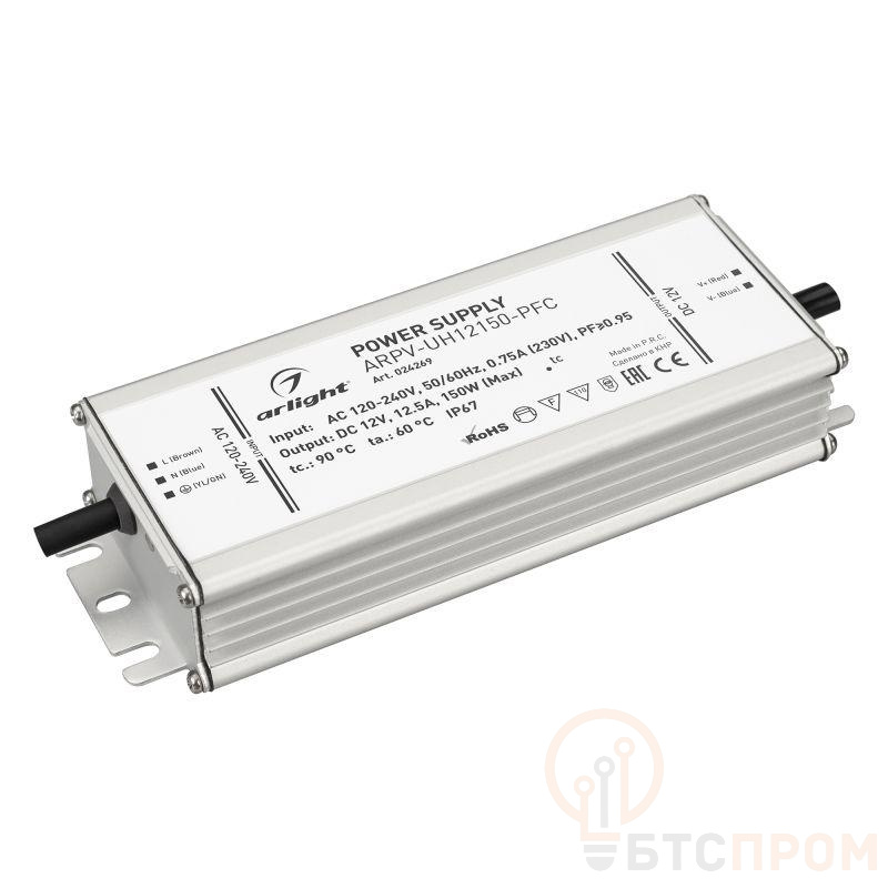 Источник напряжения с гальванической развязкой для светодиодных изделий. Входное напряжение 120-240 VAC. Выходные параметры: 12 В, 12.5 А, 150 Вт. Встроенный PFC >0,95. Герметичный алюминиевый корпус IP 67. Рабочая температура -40…+70C?. Габаритные размеры длина 188 мм, ширина 67.5 мм, высота 33.5 мм. Гарантийный срок 7 лет.