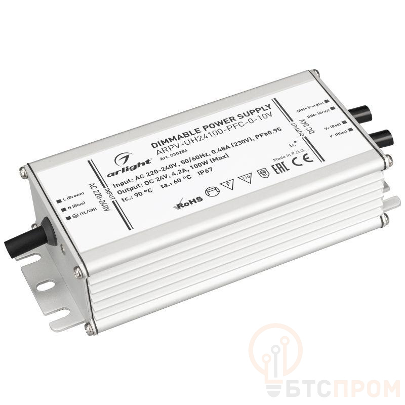 Диммируемый источник напряжения по стандарту 0/1-10 В с гальванической развязкой для светодиодных изделий. Входное напряжение 220-240 VAC. Выходные параметры: 24 В, 4.2 А, 100 Вт. Встроенный PFC >0.95. Герметичный алюминиевый корпус IP 67. Рабочая температура -40…+70C?. Габаритные размеры длина 158 мм, ширина 67.5 мм, высота 38.5 мм. Гарантийный срок 7 лет.
