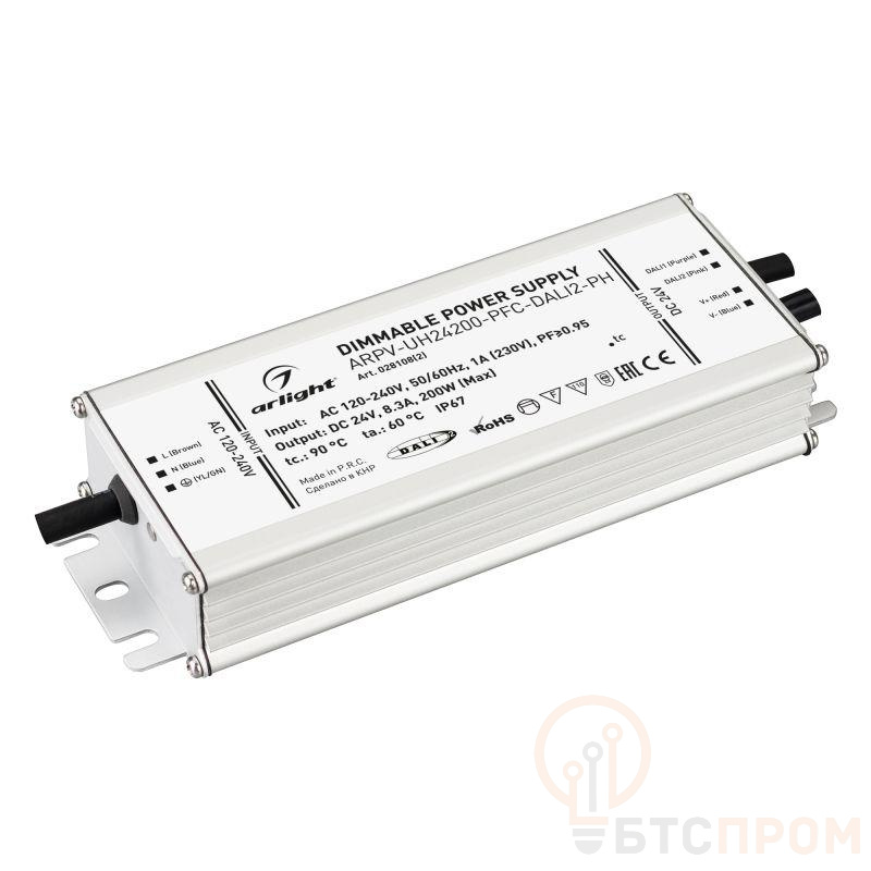 Диммируемый источник напряжения по протоколу DALI2.0 с гальванической развязкой для светодиодных изделий. Входное напряжение 120-240 VAC. Выходные параметры: 24 В, 8.3 А, 200 Вт. Встроенный PFC >0.95. Герметичный алюминиевый корпус IP 67. Рабочая температура -40…+70C?. Габаритные размеры длина 188 мм, ширина 67.5 мм, высота 38.5 мм. Гарантийный срок 7 лет. Режим CV+CC - при превышении выходной мощности снижается напряжение, переходит в режим источника тока.