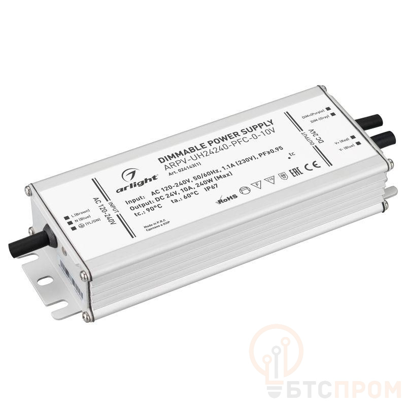 Диммируемый источник напряжения по стандарту 0/1-10 В с гальванической развязкой для светодиодных изделий. Входное напряжение 120-240 VAC. Выходные параметры: 24 В, 10 А, 240 Вт. Встроенный PFC >0.95. Герметичный алюминиевый корпус IP 67. Рабочая температура -40…+70C?. Габаритные размеры длина 188 мм, ширина 67.5 мм, высота 38.5 мм. Гарантийный срок 7 лет. Режим CV+CC - при превышении выходной мощности снижается напряжение, переходит в режим источника тока.