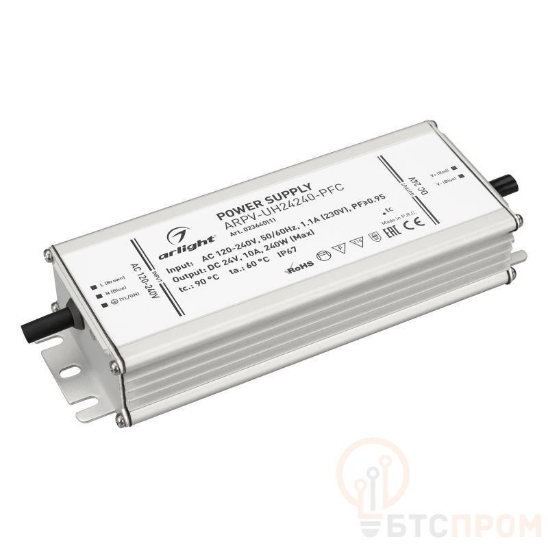 Источник напряжения с гальванической развязкой для светодиодных изделий. Входное напряжение 120-240 VAC. Выходные параметры: 24 В, 10 А, 240 Вт. Встроенный PFC >0.95. Герметичный алюминиевый корпус IP 67. Рабочая температура -40…+70C?. Габаритные размеры длина 188 мм, ширина 67.5 мм, высота 38.5 мм. Гарантийный срок 7 лет. Режим CV+CC - при превышении выходной мощности снижается напряжение, переходит в режим источника тока.