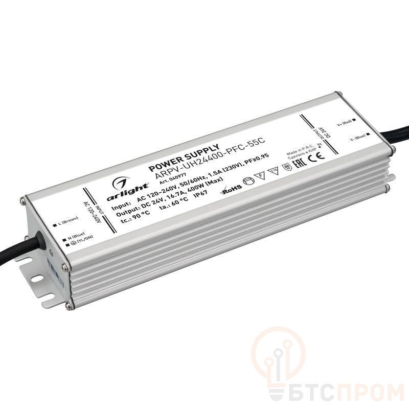 Источник напряжения с гальванической развязкой для светодиодных изделий. Предназначен для работы в условиях Крайнего Севера с запуском до -55С. Входное напряжение 120-240 VAC. Выходные параметры: 24 В, 16.7 А, 400 Вт. Встроенный PFC >0,95. Герметичный алюминиевый корпус IP 67. Рабочая температура -55…+70C?. Габаритные размеры длина 251 мм, ширина 90 мм, высота 41.5 мм. Гарантийный срок 5 лет. Режим CV+CC - при превышении выходной мощности снижается напряжение, переходит в режим источника тока.