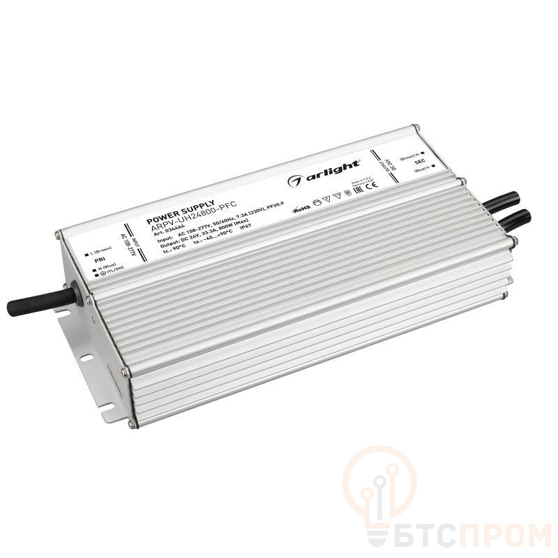 Источник напряжения с гальванической развязкой для светодиодных изделий. Входное напряжение 108-277 VAC. Выходные параметры: 24 В, 33.3 А, 800 Вт. Встроенный PFC >0.9. Герметичный алюминиевый корпус IP 67. Рабочая температура -40…+70C?. Габаритные размеры длина 262 мм, ширина 125 мм, высота 49 мм. Гарантийный срок 7 лет.