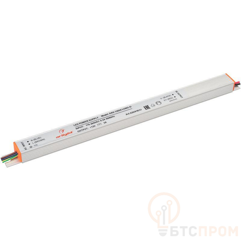 Источник напряжения с гальванической развязкой для светодиодных изделий. Входное напряжение 200-240 VAC. Выходные параметры: 12 В, 2 А, 24 Вт. Встроенный PFC >0,5. Негерметичный алюминиевый корпус IP 20. Габаритные размеры длина 288 мм, ширина 18 мм, высота 15 мм. Гарантийный срок 2 года.