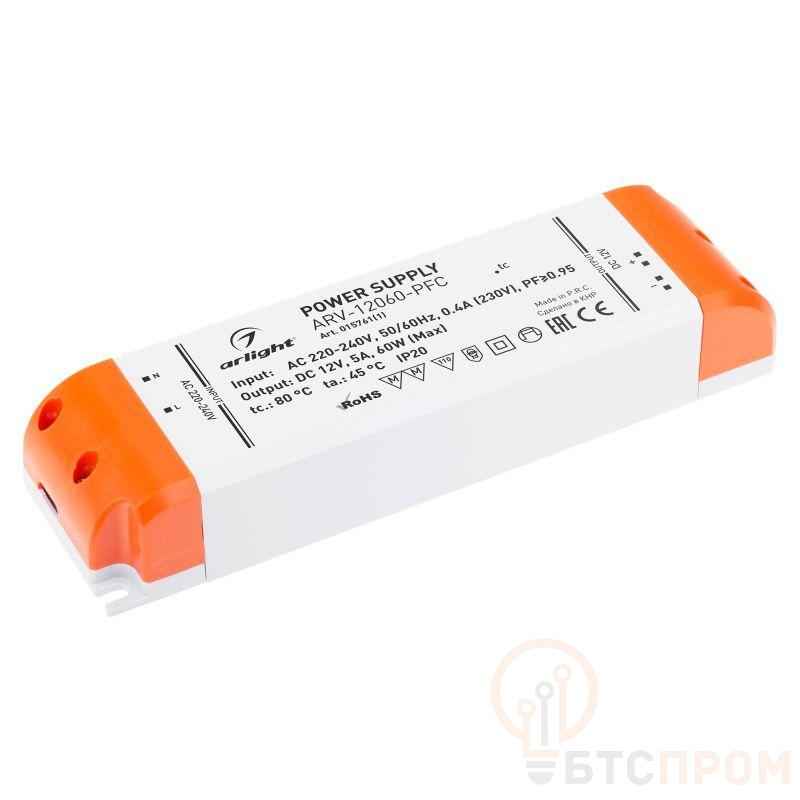 Источник напряжения с гальванической развязкой для светодиодных изделий. Входное напряжение 220-240 VAC. Выходные параметры: 12 В, 5 А, 60 Вт. Встроенный PFC >0,95. Негерметичный пластиковый корпус IP 20. Габаритные размеры длина 180 мм, ширина 52 мм, высота 30 мм. Гарантийный срок 2 года.