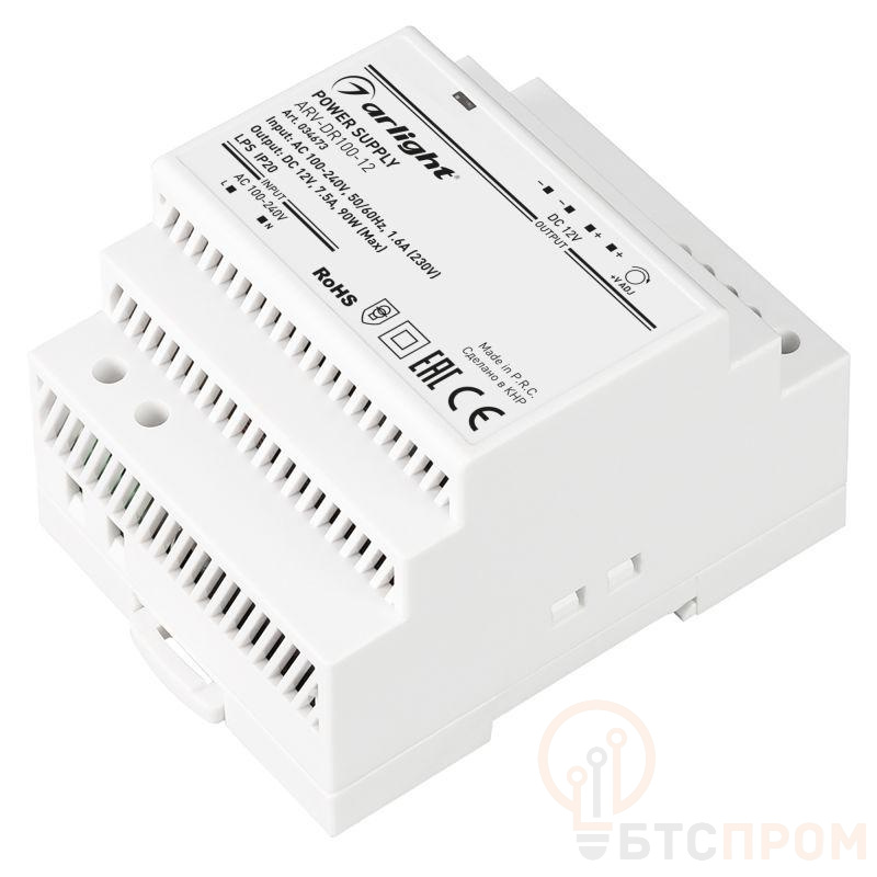 Источник напряжения с гальванической развязкой для светодиодных изделий. Входное напряжение 100-240 VAC. Выходные параметры: 12 В, 7.5 А, 90 Вт. Негерметичный пластиковый корпус IP 20 для установки на DIN-рейку. Габаритные размеры длина 58 мм, ширина 70 мм, высота 90 мм. Гарантийный срок 3 года. При нагрузке менее 10% после отключения от сети, повторное включение блока питания может быть с задержкой (до 30с)