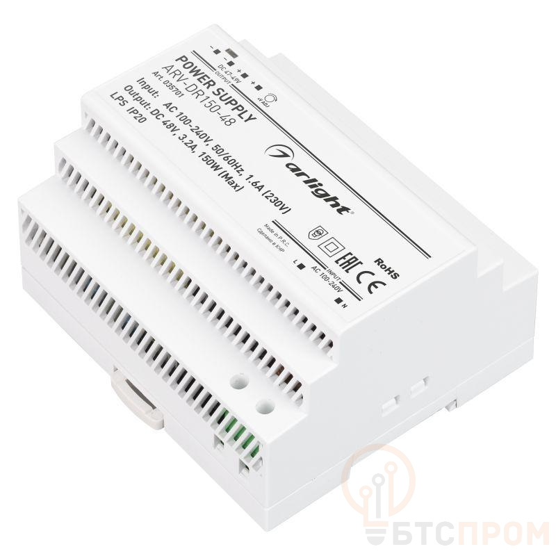 Источник напряжения с гальванической развязкой для светодиодных изделий. Входное напряжение 100-240 VAC. Выходные параметры: 48 В, 3.2 А, 150 Вт. Негерметичный пластиковый корпус IP 20 для установки на DIN-рейку. Габаритные размеры длина 58 мм, ширина 105 мм, высота 90 мм. Гарантийный срок 3 года. При нагрузке менее 10% после отключения от сети, повторное включение блока питания может быть с задержкой (до 30с)