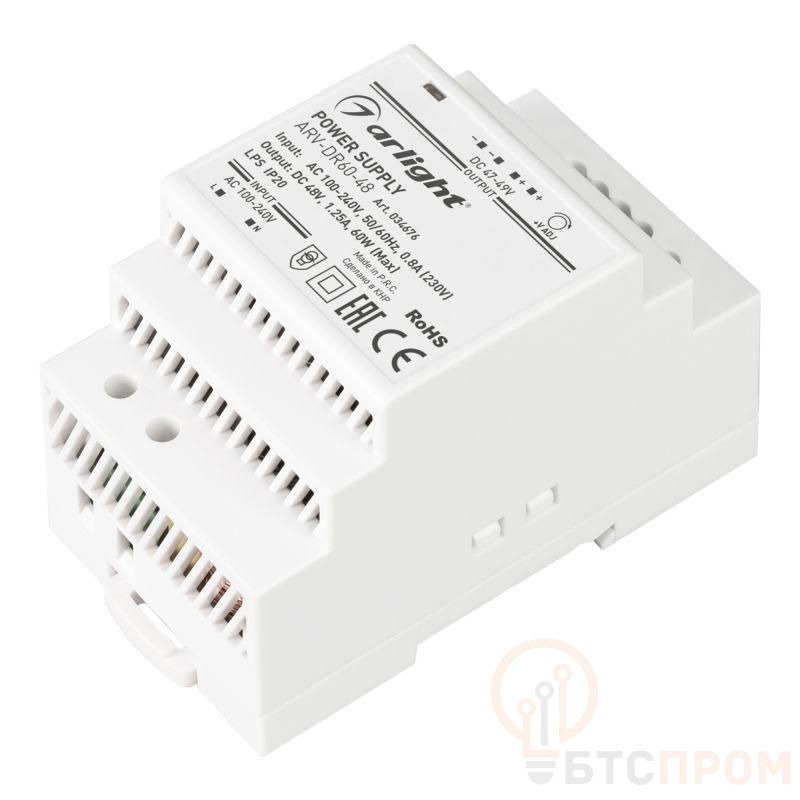 Источник напряжения с гальванической развязкой для светодиодных изделий. Входное напряжение 100-240 VAC. Выходные параметры: 48 В, 1.25 А, 60 Вт. Негерметичный пластиковый корпус IP 20 для установки на DIN-рейку. Габаритные размеры длина 58 мм, ширина 52.5 мм, высота 90 мм. Гарантийный срок 3 года. При нагрузке менее 10% после отключения от сети, повторное включение блока питания может быть с задержкой (до 30с)