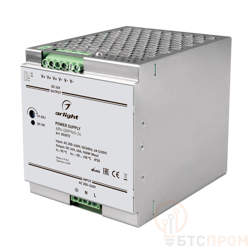 Источник напряжения с гальванической развязкой для светодиодных изделий. Входное напряжение 200-240 VAC. Выходные параметры: 24 В, 40 А, 960 Вт. Негерметичный металлический корпус IP 20 для установки на DIN-рейку. Встроенный PFC >0,95. Возможность параллельной работы до 4 блоков питания. Наличие контактов состояния выхода DC OK. Габаритные размеры длина 110 мм, ширина 150 мм, высота 125 мм. Гарантийный срок 5 лет.