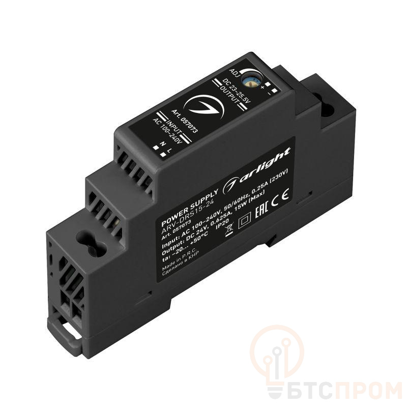 Блок питания ARV-DRS-15-24 — это компактный и надежный источник питания, предназначенный для монтажа на стандартную DIN-рейку. Устройство обеспечивает стабилизированное выходное напряжение 24 В постоянного тока с мощностью 15 Вт и силой тока 0.63 А. Корпус имеет степень защиты IP20, что гарантирует безопасную работу в условиях защищенных от влаги и пыли помещений.