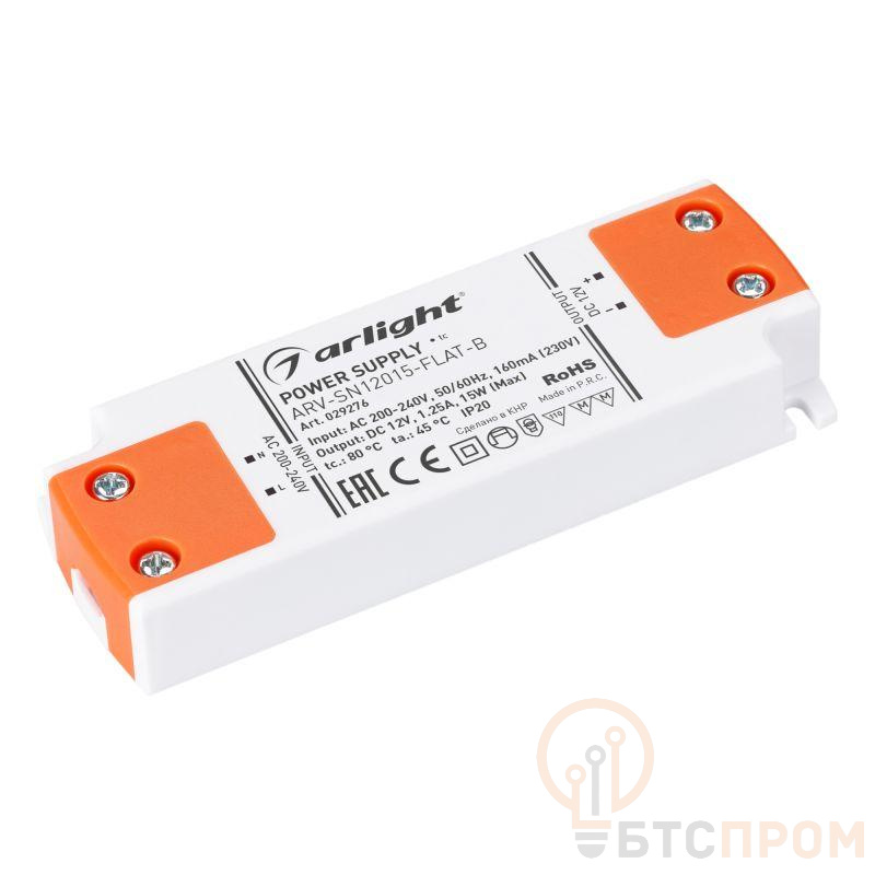 Источник напряжения с гальванической развязкой для светодиодных изделий. Входное напряжение 200-240 VAC. Выходные параметры: 12 В, 1,25 А, 15 Вт. Встроенный PFC >0,5. Негерметичный пластиковый корпус IP 20. Габаритные размеры длина 103 мм, ширина 36 мм, высота 16 мм. Гарантийный срок 3 года.