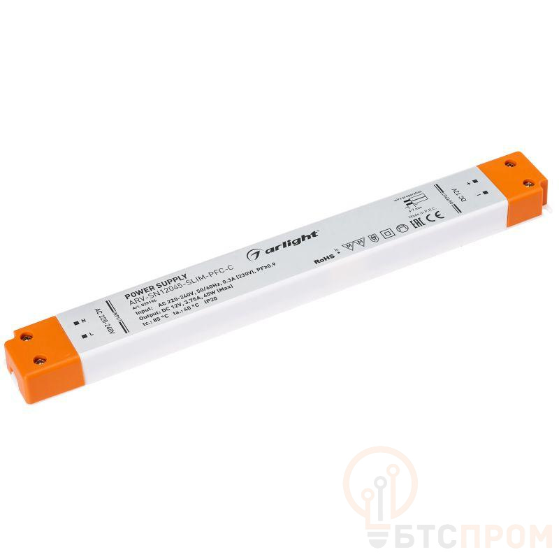 Источник напряжения с гальванической развязкой для светодиодных изделий. Входное напряжение 220-240 VAC. Выходные параметры: 12 В, 3,75 А, 45 Вт. Встроенный PFC >0,9. Негерметичный пластиковый корпус IP 20. Габаритные размеры длина 251 мм, ширина 30 мм, высота 16 мм. Гарантийный срок 3 года.