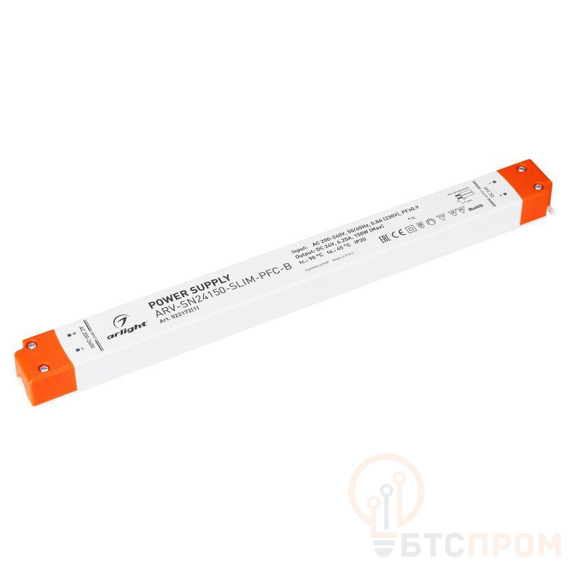 Источник напряжения с гальванической развязкой для светодиодных изделий. Входное напряжение 200-240 VAC. Выходные параметры: 24 В, 6.25 А, 150 Вт. Встроенный PFC >0.95. Негерметичный пластиковый корпус IP 20. Габаритные размеры длина 320 мм, ширина 30 мм, высота 18 мм. Гарантийный срок 3 года.