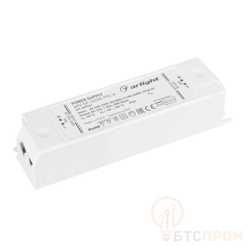 Источник напряжения с гальванической развязкой для светодиодных изделий. Входное напряжение 220-240 VAC. Выходные параметры: 24 В 1.25 А, максимальная мощность 30 Вт. Встроенный PFC >0.95. Негерметичный пластиковый корпус IP 20. Габаритные размеры длина 135 мм, ширина 36 мм, высота 25 мм. Гарантийный срок 5 лет.