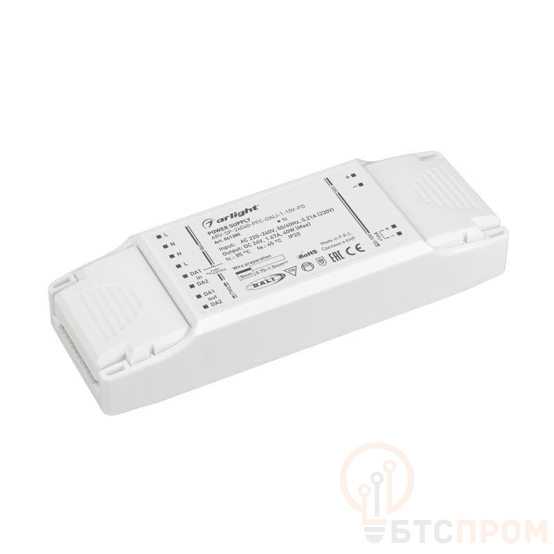 Блок питания 24V, ток 1.67А, 40Вт, с управлением DALI, 1-10V и функцией PUSH DIM, с корректором мощности, PF>0,95. Тонкий пластиковый корпус IP20. Вход: 220-240VAC. Размер 150х52х28 mm. Гарантия 5 лет.
