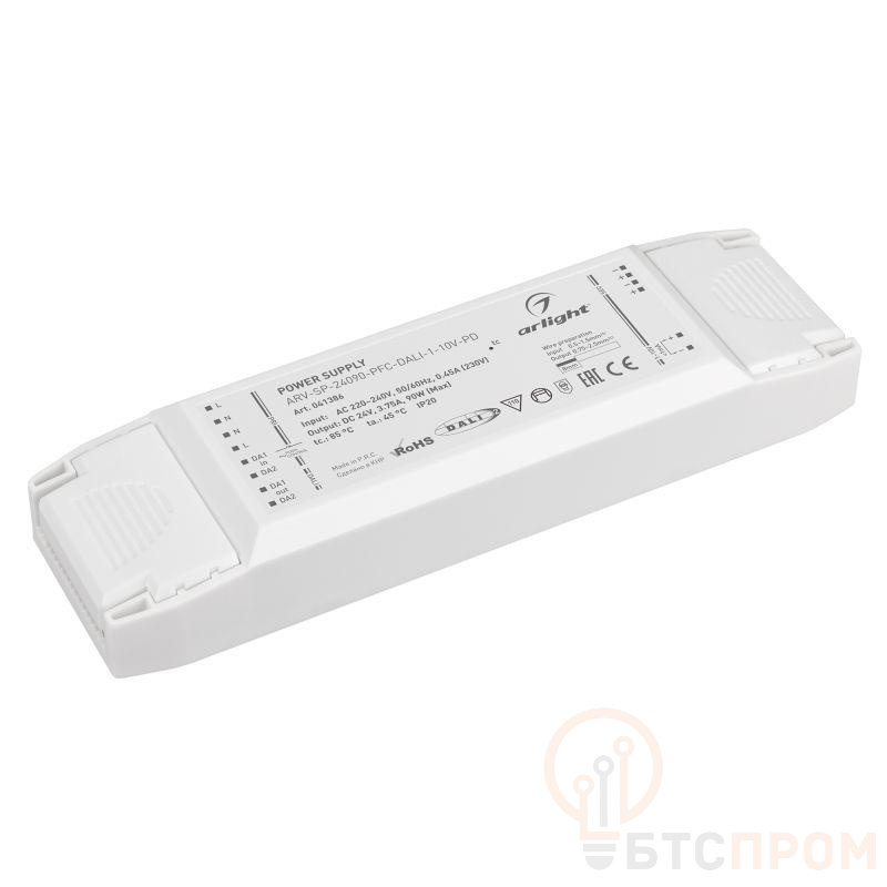 Блок питания 24V, ток 3.75А, 90Вт, с управлением DALI, 1-10V и функцией PUSH DIM, с корректором мощности, PF>0,99. Тонкий пластиковый корпус IP20. Вход: 220-240VAC. Размер 205х58х30 mm. Гарантия 5 лет.