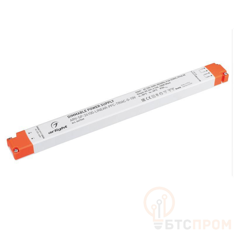 Диммируемый источник напряжения по стандарту TRIAC / 0/1-10В с гальванической развязкой для светодиодных изделий. Входное напряжение 220-240 VAC. Выходные параметры: 24 В, 4.16А, 100 Вт. Встроенный PFC >0.98. Негерметичный пластиковый корпус IP 20. Габаритные размеры длина 336.6 мм, ширина 30 мм, высота 18.2 мм. Присутствует ШИМ на выходе. Гарантийный срок 5 лет.
