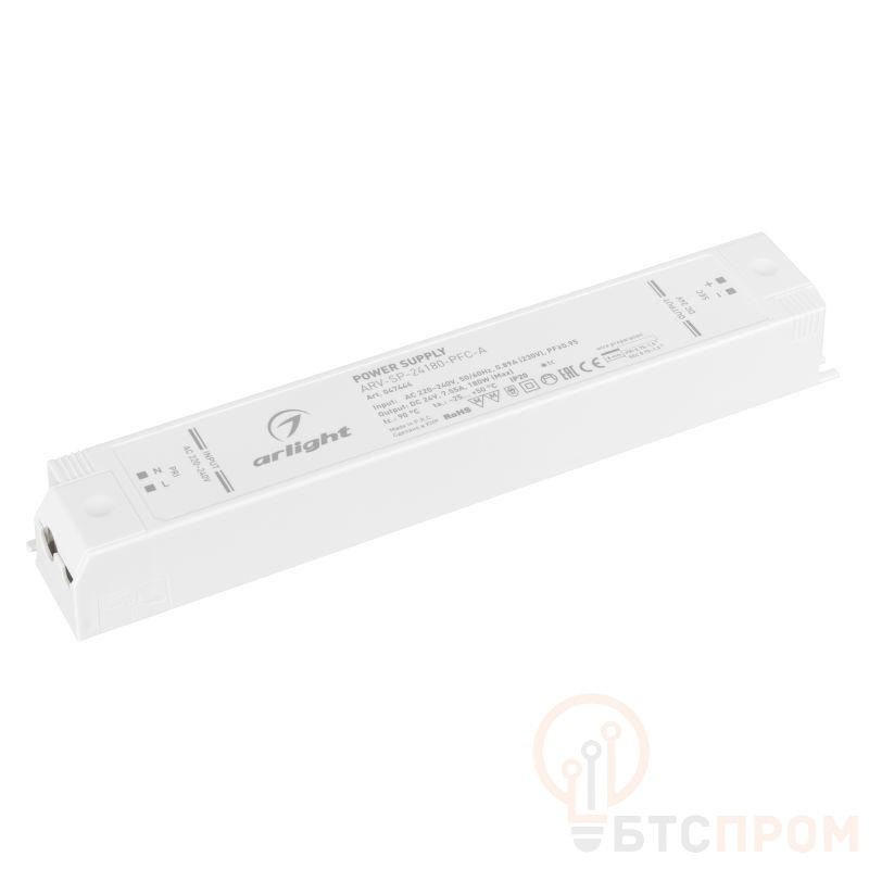 Источник напряжения с гальванической развязкой для светодиодных изделий. Входное напряжение 220-240 VAC. Выходные параметры: 24 В 7.5 А, максимальная мощность 180 Вт. Встроенный PFC >0.95. Негерметичный пластиковый корпус IP 20. Габаритные размеры длина 253 мм, ширина 43 мм, высота 31 мм. Гарантийный срок 5 лет.