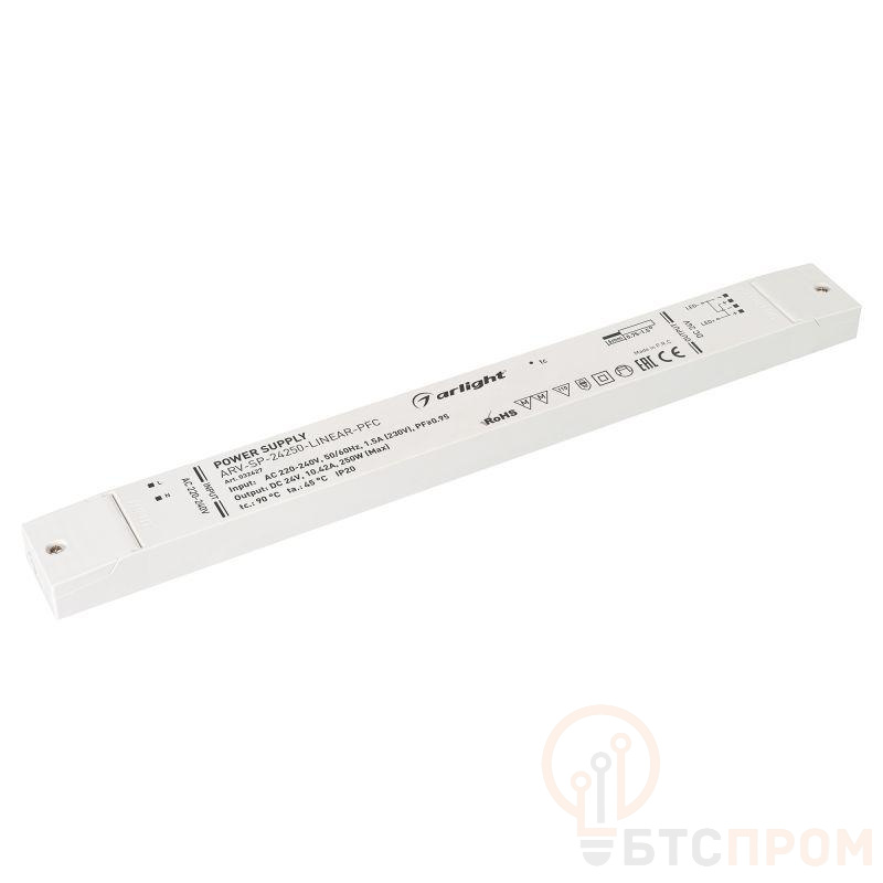 Источник напряжения с гальванической развязкой для светодиодных изделий. Входное напряжение 220-240 VAC. Выходные параметры: 24 В, 10.42 А, 250 Вт. Встроенный PFC >0.95. Тонкий пластиковый корпус IP 20. Габаритные размеры длина 400 мм, ширина 40 мм, высота 22 мм. Гарантийный срок 5 лет.