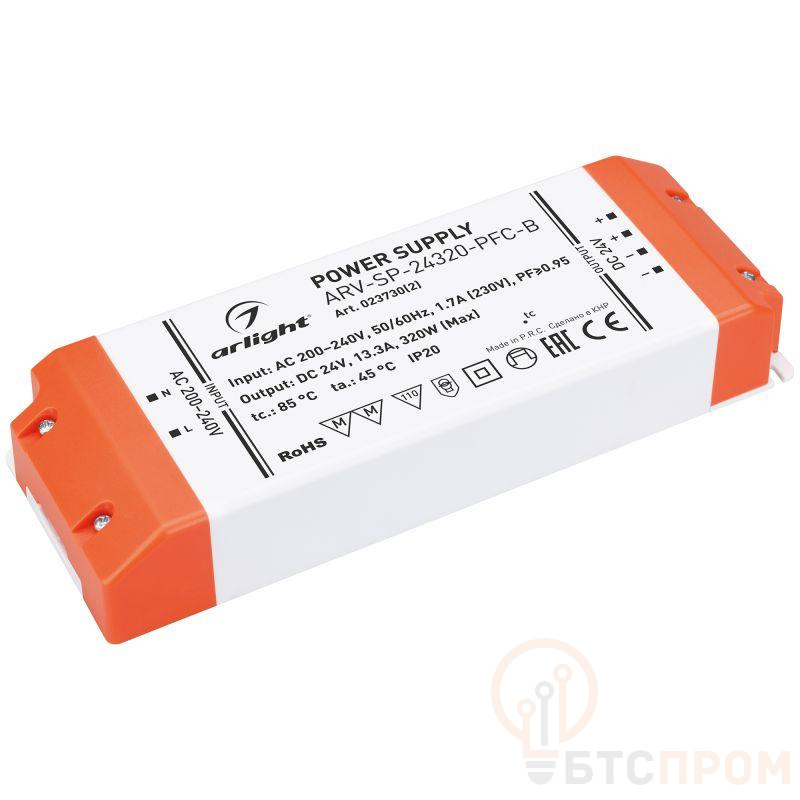 Источник напряжения с гальванической развязкой для светодиодных изделий. Входное напряжение 220-240 VAC. Выходные параметры: 24 В, 13.3 А, 320 Вт. Встроенный PFC >0.95. Негерметичный пластиковый корпус IP 20. Габаритные размеры длина 215 мм, ширина 77 мм, высота 35 мм. Гарантийный срок 5 лет.