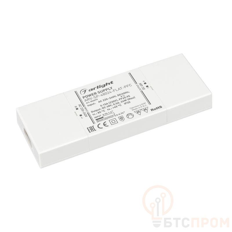 Источник напряжения с гальванической развязкой для светодиодных изделий. Входное напряжение 220-240 VAC. Выходные параметры: 48 В, 0.5 А, 24 Вт. Встроенный PFC >0.95. Сверхтонкий пластиковый корпус IP20. Габаритные размеры длина 137 мм, ширина 50 мм, высота 16 мм. Гарантийный срок 5 лет.