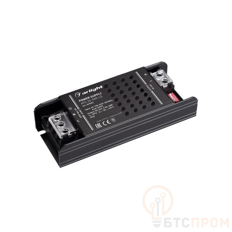 Источник напряжения с гальванической развязкой для светодиодных изделий. Входное напряжение 198-242 VAC. Выходные параметры: 24 В, 2.5 А, 60 Вт. Негерметичный алюминиевый сетчатый корпус IP 20. Возможность регулировки яркости с помощью DIP-переключателей. Функция плавного пуска, время выхода на полную яркость - 5 сек. Габаритные размеры длина 131 мм, ширина 52 мм, высота 27 мм. Гарантийный срок 5 лет.