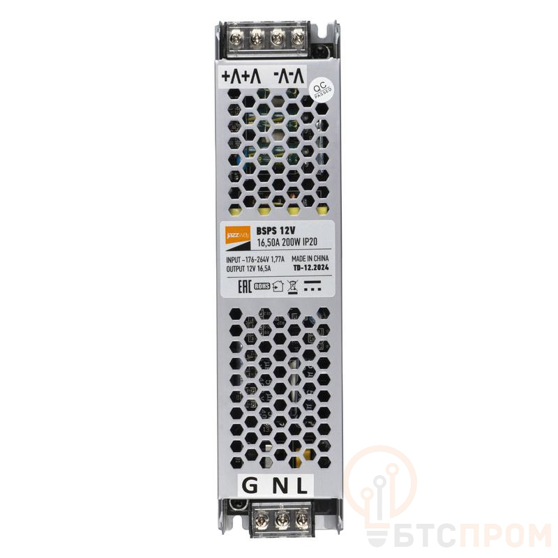Блок питания BSPS-200-12 — это надежный источник питания для светодиодного оборудования, выполненный в прочном металлическом перфорированном корпусе. Модель обеспечивает стабильное выходное напряжение 12 В постоянного тока с мощностью 200 Вт и силой тока до 16.5 А, что гарантирует бесперебойную работу даже протяженных светодиодных систем.