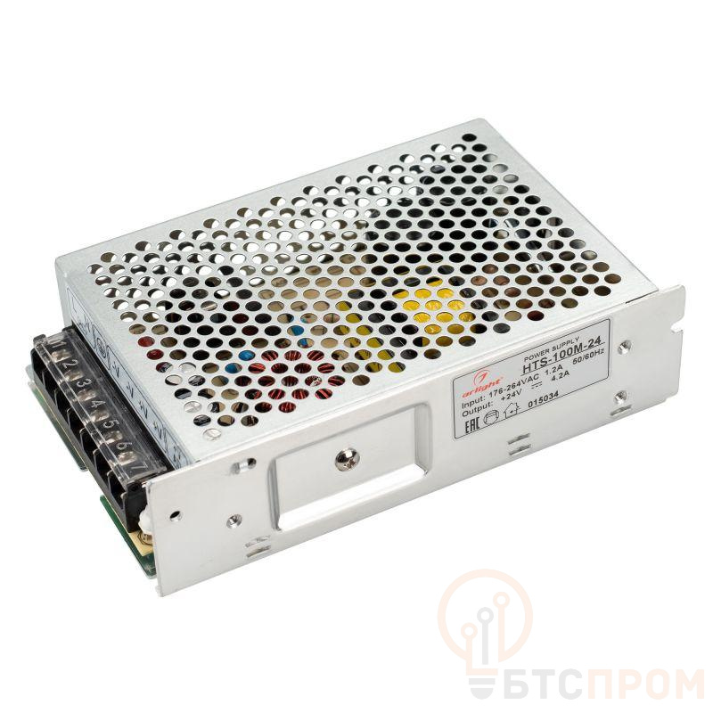 Источник напряжения с гальванической развязкой для светодиодных изделий. Входное напряжение 176-264 VAC. Выходные параметры: 24 В, 4,2 А, 100 Вт. Встроенный PFC >0,5. Негерметичный алюминиевый сетчатый корпус IP 20. Габаритные размеры длина 159 мм, ширина 98 мм, высота 42 мм. Гарантийный срок 3 года.