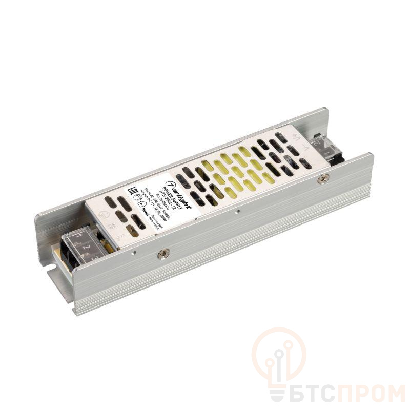 Источник напряжения с гальванической развязкой для светодиодных изделий. Входное напряжение 176-264 VAC. Выходные параметры: 12 В, 16,7 А, 200 Вт. Встроенный PFC >0,5. Негерметичный алюминиевый сетчатый корпус IP 20. Габаритные размеры длина 202 мм, ширина 49 мм, высота 30 мм. Гарантийный срок 3 года.