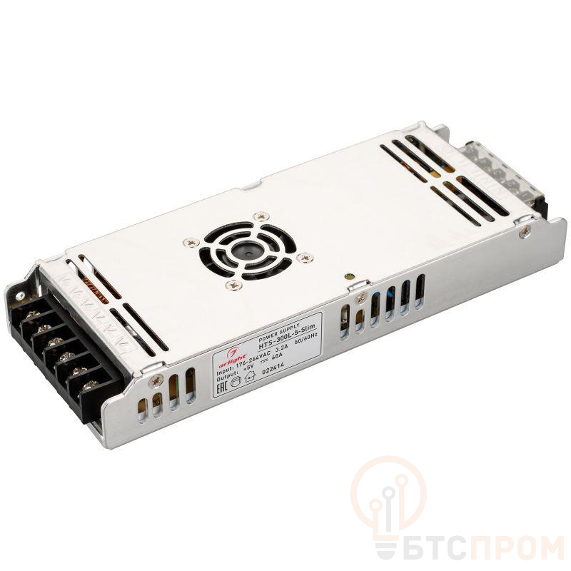 Источник напряжения с гальванической развязкой для светодиодных изделий. Входное напряжение 176-264 VAC. Выходные параметры: 5 В, 60 А, 300 Вт. Негерметичный алюминиевый сетчатый корпус IP 20. Габаритные размеры длина 212 мм, ширина 83 мм, высота 30 мм. Встроенный вентилятор без автоконтроля температуры. Гарантийный срок 3 года.