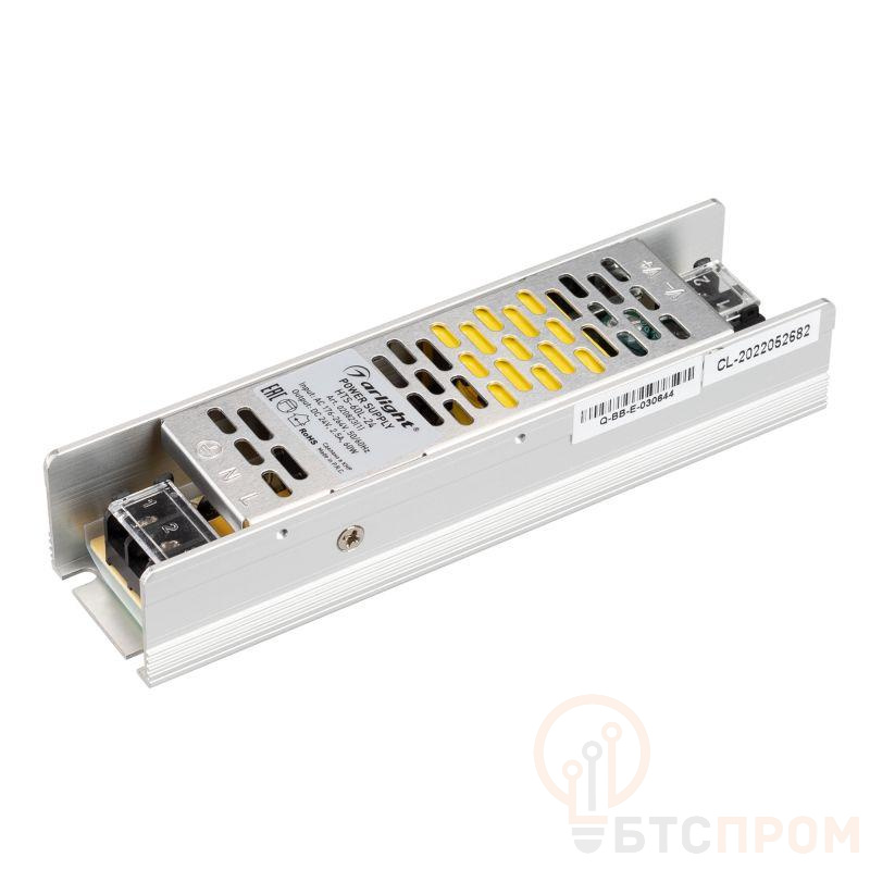 Источник напряжения с гальванической развязкой для светодиодных изделий. Входное напряжение 176-264 VAC. Выходные параметры: 24 В, 2,5 А, 60 Вт. Встроенный PFC >0,5. Негерметичный алюминиевый сетчатый корпус IP 20. Габаритные размеры длина 156 мм, ширина 40 мм, высота 29 мм. Гарантийный срок 3 года.