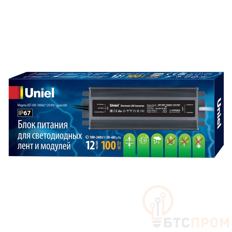 Блок питания UET-VAF-100A67 12В IP67 ультратонкий 100Вт метал. корпус Uniel UL-00007576 фото в каталоге от BTSprom.by