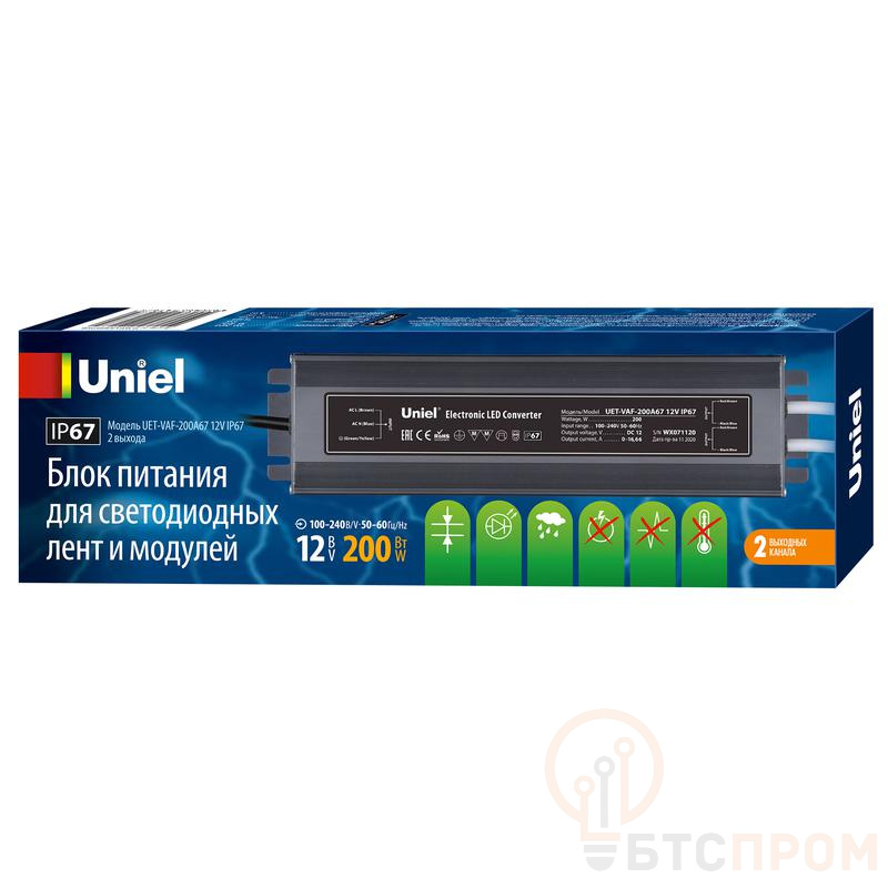 Блок питания UET-VAF-200A67 12В IP67 2 выхода ультратонкий 200Вт метал. корпус Uniel UL-00007579