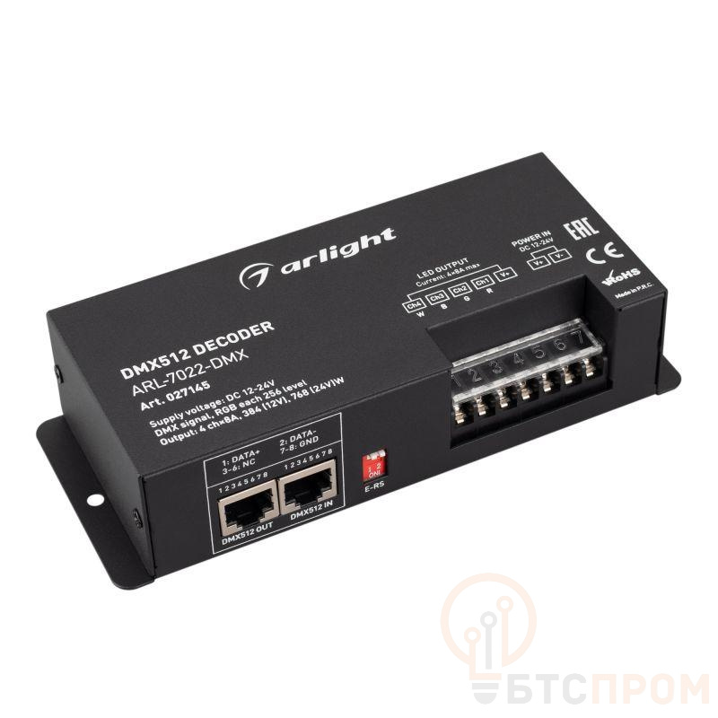 Декодер сигнала DMX512 в ШИМ (PWM). Напряжение питания DC 12-24V, 4 канала управления, ток нагрузки до 8А на канал, максимальная мощность 384-768W, разъём XLR3. Адреса устанавливаются DIP-переключателями на корпусе. Габариты 164х65х40 мм.