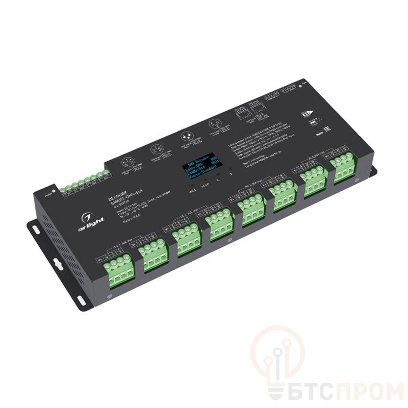 Декодер DMX512 для трансляции DMX512 сигнала ШИМ(PWM) устройствам. Питание 12-24VDC. 24 канала, ток нагрузки 24x5A, ток нагрузки 24x5A, мощность нагрузки 1440-2880W. Входной сигнал DMX512, выходной сигнал ШИМ(PWM). Изменяемая частота ШИМ от 250Гц до 8000Гц. Возможность работы в режиме "Master". Цифровой порт XLR3 и XLR5, разъемы RJ45, терминальные клеммы. Цифровой дисплей на корпусе, адрес устанавливается с помощью кнопок. OLED дисплей. Размер 324x116x38.5 мм.