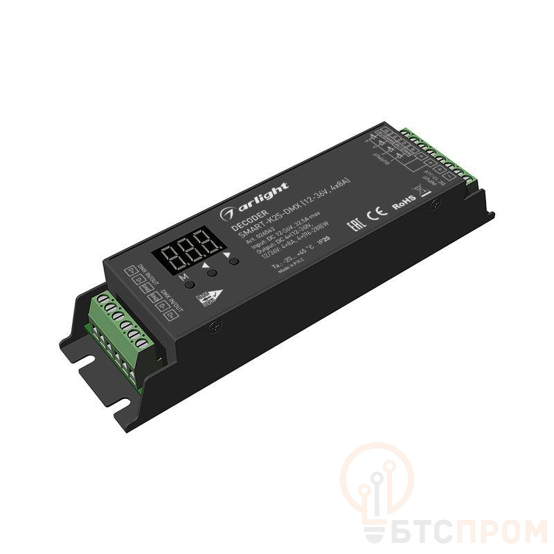 Декодер DMX512 для трансляции DMX512 сигнала ШИМ(PWM) устройствам. Питание 12-36VDC. 4 канала, ток нагрузки 4x8A, мощность нагрузки 384-1152W. Входной сигнал DMX512, выходной сигнал ШИМ(PWM). Терминальные клеммы подключения. Размер 175х46х32 мм.
