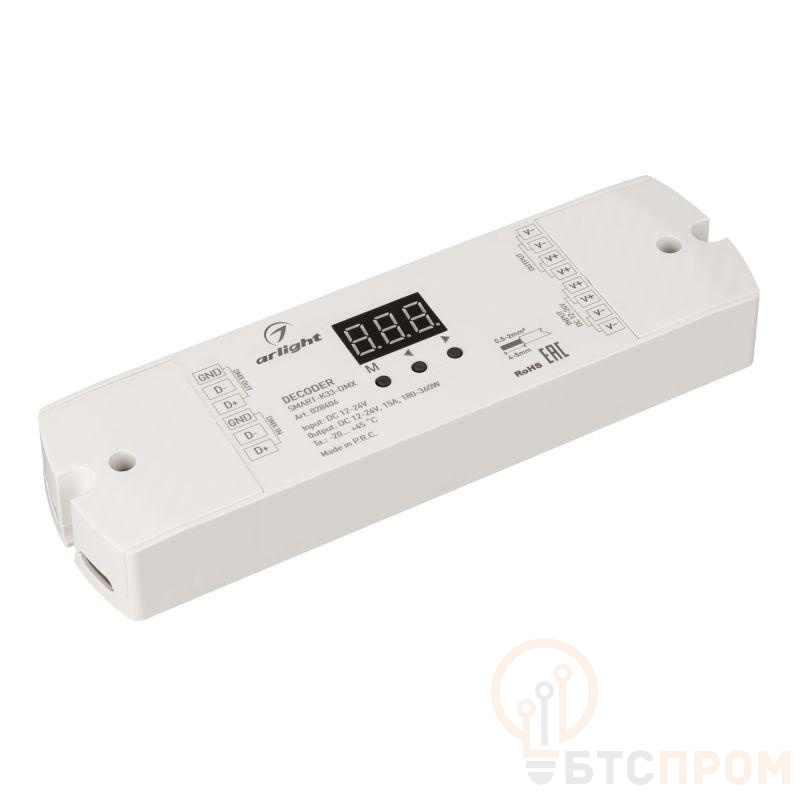 Декодер DMX512 для трансляции DMX512 сигнала ШИМ(PWM) устройствам. Питание 12-24VDC. 1 канал, ток нагрузки 1x15A, мощность нагрузки 180-360W. Входной сигнал DMX512, выходной сигнал ШИМ(PWM), 15A - 250/500/1000/ 2000/4000/8000 Гц, 8A -16000 Гц, 6A - 32000 Гц. Цифровой дисплей на корпусе, адрес устанавливается с помощью кнопок. Размер 170x50x23 мм.