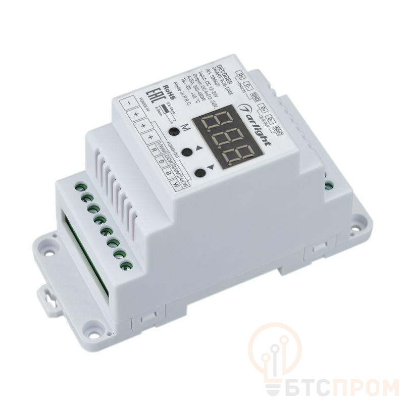 Декодер DMX512 для трансляции DMX512 сигнала ШИМ(PWM) устройствам. Питание 12-24VDC. 4 канала, ток нагрузки 4x5A, мощность нагрузки 240-480W. Входной сигнал DMX512, выходной сигнал ШИМ(PWM). Цифровой дисплей на корпусе, адрес устанавливается с помощью кнопок. Размер 110х48х67 мм. Корпус PVC. Для использования на DIN-рейке.