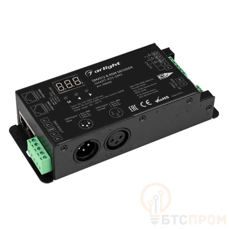 Декодер DMX512 для 230V светодиодных лент и гибкого неона. Питание AC 110-240V, выходное напряжение DC 110-240V. 3 канала, ток нагрузки 3x1.5A, мощность нагрузки 495-1080W. Входной сигнал DMX512 (XLR3, RJ45 терминальные клеммы), выходной сигнал ШИМ(PWM) (терминальные клеммы). Цифровой дисплей. Совместим с пультами и панелями серии SMART, поддерживающими управление по радиоканалу. Размер 165x70x38 мм.
