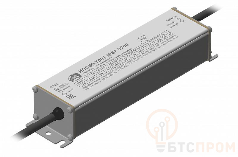 Драйвер Аргос ИПС80-700Т IP67 5200 — это надежный источник постоянного тока, предназначенный для стабильного питания мощных светодиодных светильников. Устройство обеспечивает выходной ток 700 мА с регулируемым напряжением от 24 до 76 В и мощностью до 52 Вт. Высокий КПД (до 90%) гарантирует энергоэффективность и снижение эксплуатационных затрат.