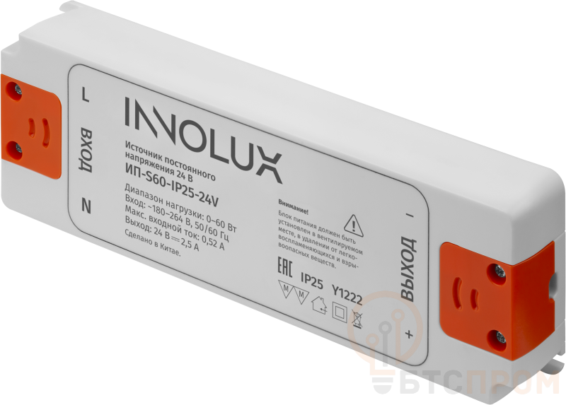 Драйвер для светодиодной ленты INNOLUX 97 430 ИП-S60-IP25-24V — это надежный источник питания, предназначенный для стабильной и долговечной работы светодиодного оборудования. Модель обладает выходной мощностью 60 Вт и обеспечивает постоянное напряжение 24 В, что делает ее идеальным решением для большинства популярных светодиодных лент.